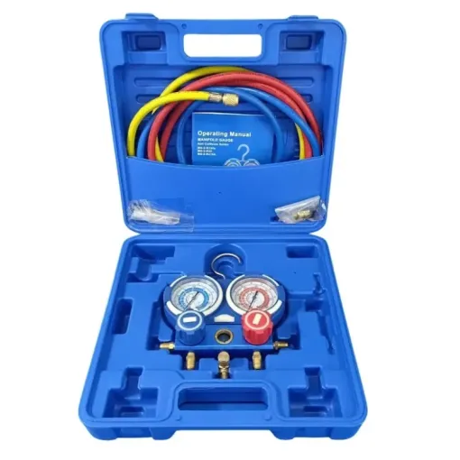 Kit Manifold 2 Voies R410A - R134a - R22 - R404A Kit By-Pass comprenant : Manifold 2 voies, corps alu avec voyant et manomètres BP et HP, crochet de fixation Fluides frigorigènes: R410A R134a R22 R404A Malette de transport Jeu de 3 flexibles SANS VANNE D'ARRET, bleu et rouge : 120 cm, 1/4" sae - 5/16" sae, jaune : 150 cm, 1/4" sae - 1/4" sae.